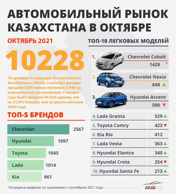Несмотря на глобальный спад мировых продаж и нехватку микрочипов, продажи новых автомобилей в Казахстане за период с января по октябрь 2021 года составили 96 836 единиц, что на 31,9 процента превышает показатели за аналогичный период прошлого года.