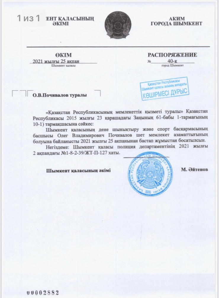 Напомним, в начале февраля в аппарат акима города Шымкента поступило письмо Департамента полиции города Шымкента о том, что руководитель Управления физической культуры и спорта города Почивалов Олег Владимирович имеет двойное гражданство: Казахстана и Российской Федерации.