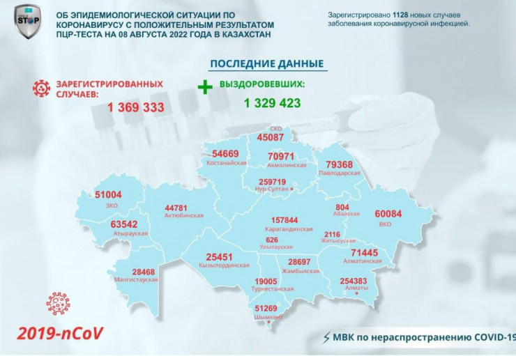 За прошедшие сутки, 8 августа, зарегистрировано 1128 новых случаев заболевания коронавирусной инфекцией, передает Tengrinews.kz со ссылкой на данные Межведомственной комиссии по нераспространению COVID-19.