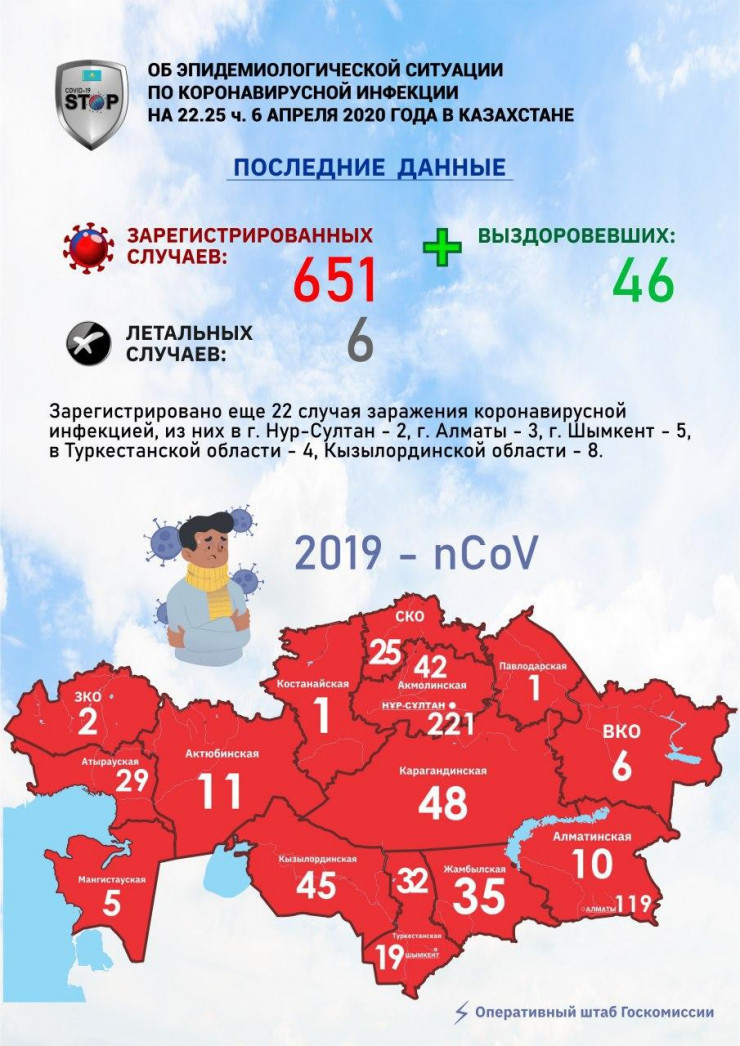 На данный час в Казахстане зарегистрирован 651 случай заражения коронавирусом COVID-19, передает Tengrinews.kz со ссылкой на coronavirus2020.kz.