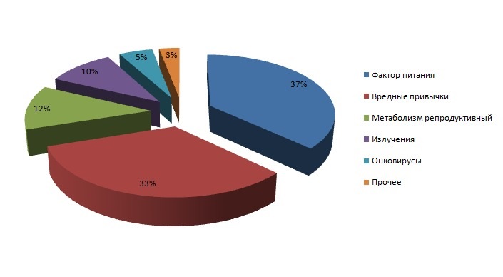 Учеными установлено, что риск рака на 30-35 процентов связан с питанием, еще столько же добавляет курение, различные инфекционные заболевания предопределяют около 17 процентов опухолей, алкоголь – 4 процента и только по 2 процента приходится на загрязненную внешнюю среду и наследственность.