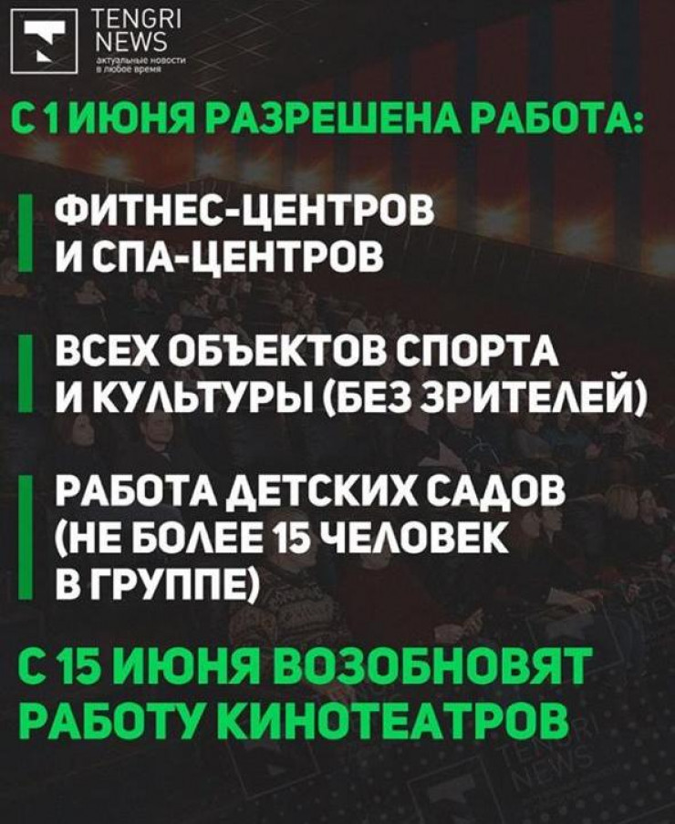 По данным акимата, с 1 июня возобновляется деятельность детских садов, кафе, ресторанов, фитнес-центров и всех объектов спорта, а также ТРЦ за исключением кинотеатров, фуд-кортов и детских игровых площадок.
