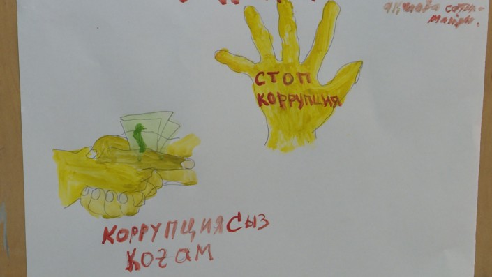 "Мы рисуем трех мужчин в пиджаках, это государственные служащие. У одного купюра на глазах - это говорит о том, что он не хочет видеть в стране коррупцию, у второго в ушах две купюры, это означает, что он не хочет слышать про взятку, и рот у него тоже закрыт купюрой - то есть он не будет говорить о взятке", - пояснила свой рисунок участница акции Самал Ануарбекова.