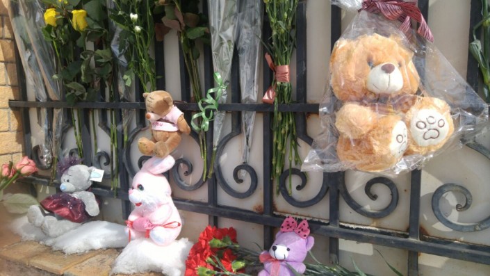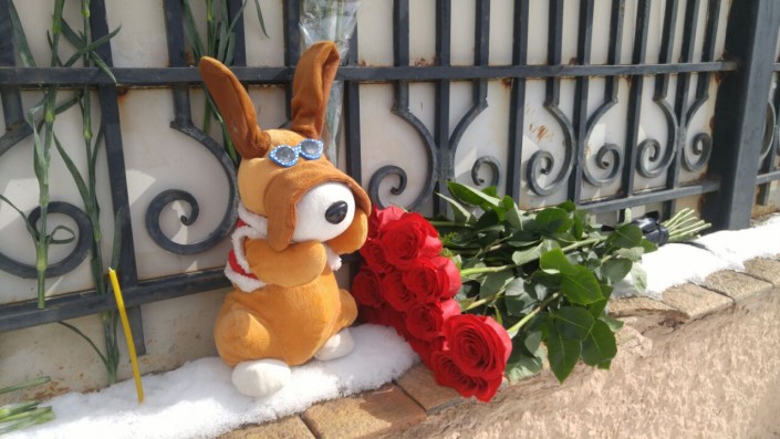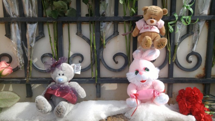 Со вчерашнего вечера к зданию посольства жители Астаны приносят цветы и мягкие игрушки в память о погибших.