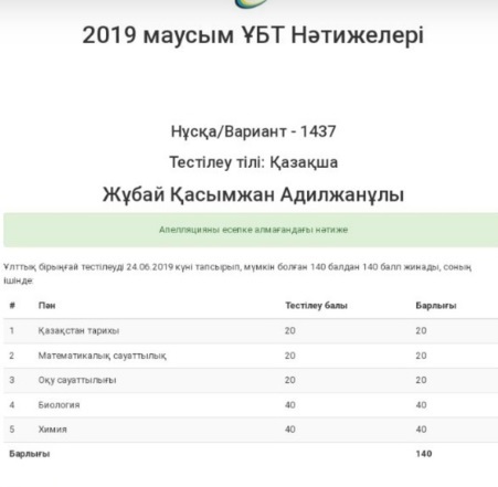 "9-сыныптан бастап биология, химия пәндерін бейінді оқи бастадым. ҰБТ-да мақсатым 140 балл жинау болды. Қорыққаным жоқ. Мен үшін барлық пән бірдей жеңіл болды. Әсіресе Қазақстан тарихы, себебі анашым мектепте осы пәннен сабақ береді. Жақсы дайындалдым. Тестілеуде соңына дейін отырдым, жауаптарымды қайтара тексеріп үлгермедім. Сұрақтардың барлығы мектеп оқулығынан келді. Тестілеуден кем дегенде 135 балл жинаймын деп ойладым, нақты қанша екенін білмедім. Үйге келген соң есімде қалған, күмәнданған сұрақтарды кітаптан қарадым", - дейді ол.
