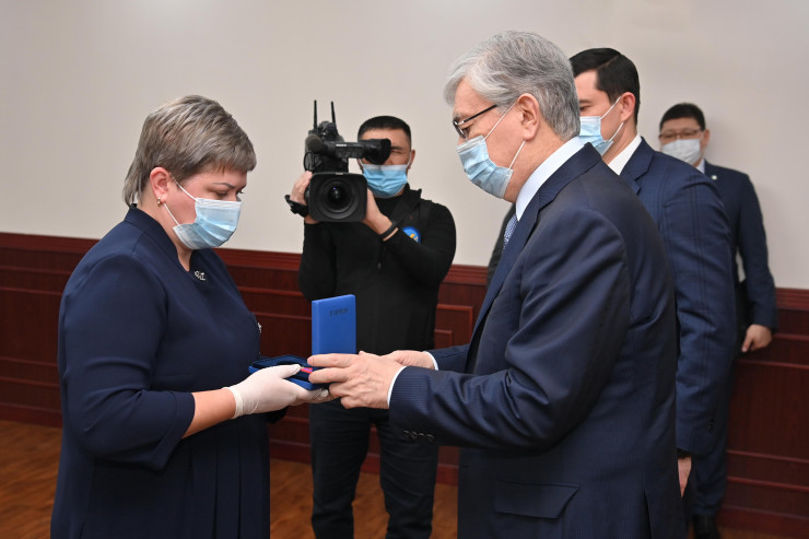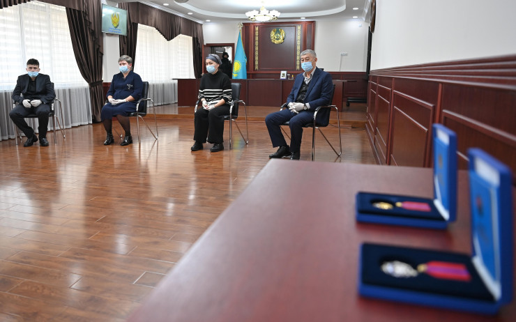 Затем Касым-Жомарт Токаев лично вручил родственникам награды, которых их мужья и отцы были удостоены за проявленную отвагу и самоотверженность при исполнении воинского и служебного долга, за подвиги, совершенные при защите интересов государства.