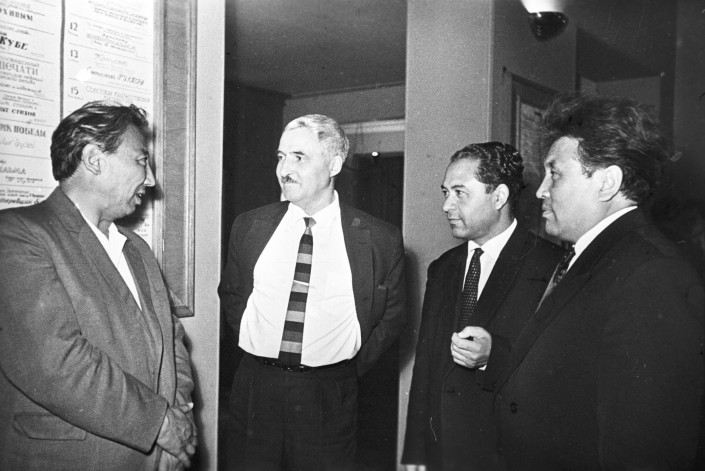 Кинорежиссер Михаил Ромм (крайний справа) во время встречи с главным редактором Алма-Атинского телевидения Игорем Саввиным (крайний слева) и кинорежиссером, оператором Берковичем М. Алма-Ата, 1958 год.