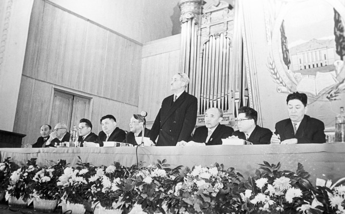 Декада казахской литературы и искусства. Константин Симонов во время открытия вечера. В президиуме (слева направо): математик Аскар Закарин; философ, специалист по проблемам национальных отношений в СССР, Нурымбек Джандильдин; писатель Мухтар Ауэзов; писатель Габит Мусрепов; государственные деятели Жумабек Ташенов; Амир Канапин; поэт Максим Рыльский. Москва, 1958 год.