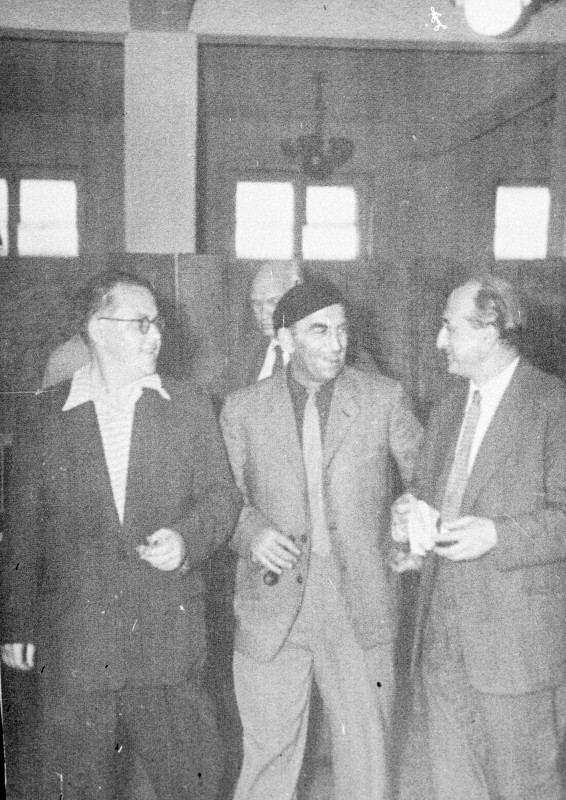 Пленум Союза писателей РСФСР. Писатели (слева направо) Абдильда Тажибаев; Константин Симонов; Мухамеджан Каратаев во время встречи. Москва, 1959 год.