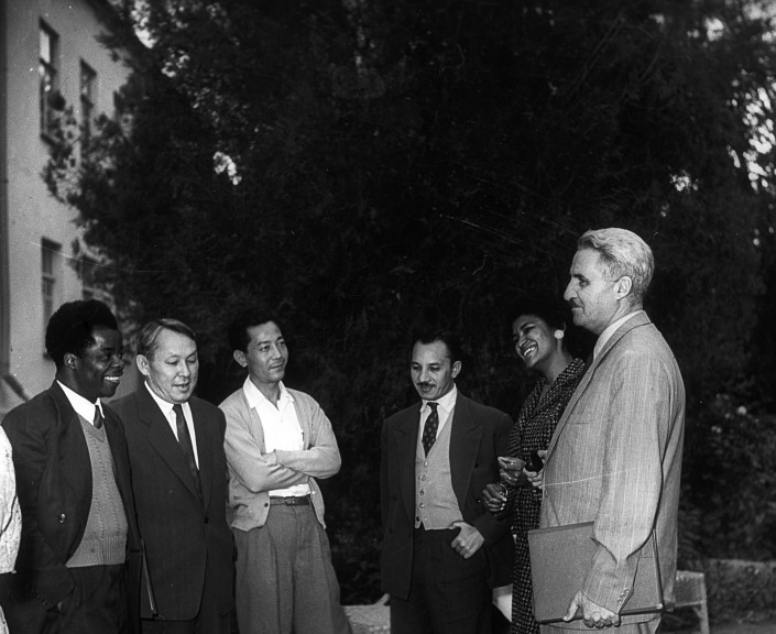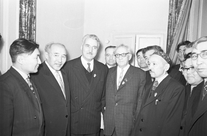 Киносценарист Константин Симонов (справа крайний), среди участников конференции писателей стран Азии и Африки. Писатель Габит Мусрепов (слева второй). Ташкент, 1958 год.