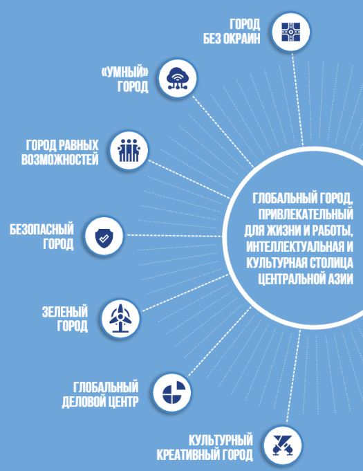 После описания этих вызовов акимат представляет вниманию семь основных приоритетов, а также собирательный образ будущего облика Алматы.