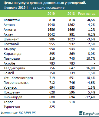 К марту цены на услуги детских дошкольных учреждений в среднем по стране сократились на 0,5 процента за год, до 810 тенге за одно посещение.