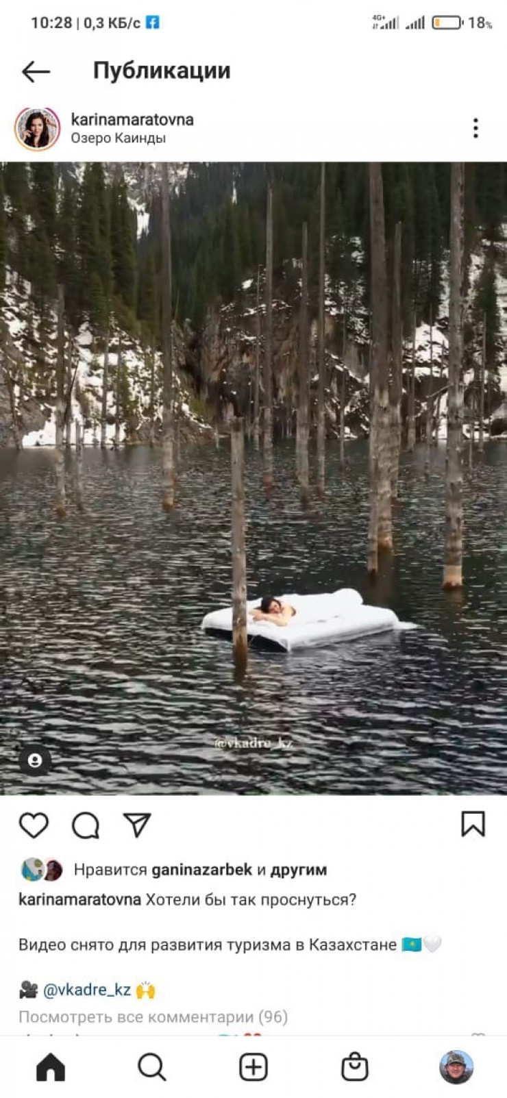 Напомним, казахстанцы сняли видеоролик на озере Каинды. На кадрах показано, как посреди знаменитого "затонувшего леса" плавает девушка на надувном матрасе. Ее поступок на территории национального парка возмутил общественность. Пост о поступке соотечественников был опубликован в Facebook на странице у натуралиста Сакена Дилдахмета, который выразил негодование из-за поступка молодых людей.