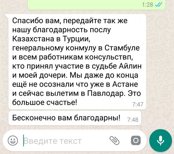 "Можно по-разному относиться к этой истории. Но для нас важнее всего то, что Айлин, ее мама и дедушка сегодня благополучно вернулись в Казахстан, к себе домой", - добавил руководитель пресс-службы МИД РК.