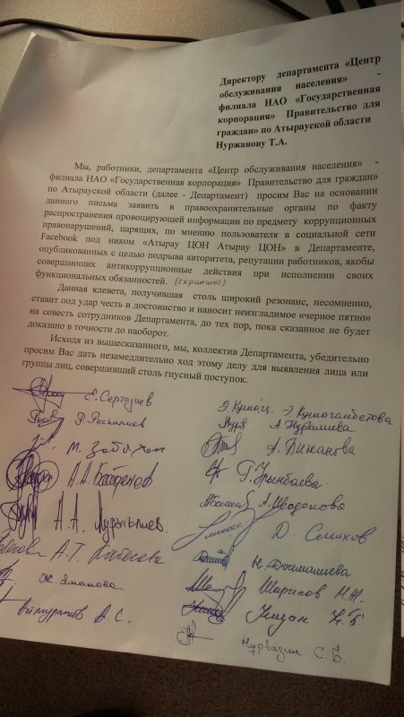 "Мы, работники ЦОН Атырауской области обращаемся к Вам с просьбой восстановить справедливость и дать возможность спокойно работать ЦОНу Атырауской области. У директора ЦОНа  Нуржанова Турлана Амангельдиевича открыта частная лавка, которая обеспечивает его безбедную жизнь. Он через своих подставных лиц, состоящих из его близких и дальних родственников, которые находятся в каждом направлении государственной услуги (накопительный, паспортный, кадровый отделы, бухгалтерия), получает взятки за оказание услуг", - говорится в письме, которое распространяют в соцсетях и через WhatsApp.