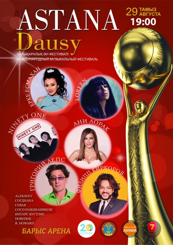 До второй ежегодной музыкальной премии Astana Dausy - 2018 остается чуть меньше недели. 29 августа на сцене Ледового дворца "Барыс Арена" со своими хитами, завоевавшими любовь зрителей со всего мира, выступят артисты из 12 стран Азии, Европы и Америки. Среди них: группа Ninety One, Григорий Лепс, Loreen, ALEKSEEV, Ани Лорак, Филипп Киркоров, Согдиана, Сосо Павлиашвили и другие. Вести вечер и представлять артистов будут не менее известные ведущие Ляйла Султанкызы и Андрей Разыграев.