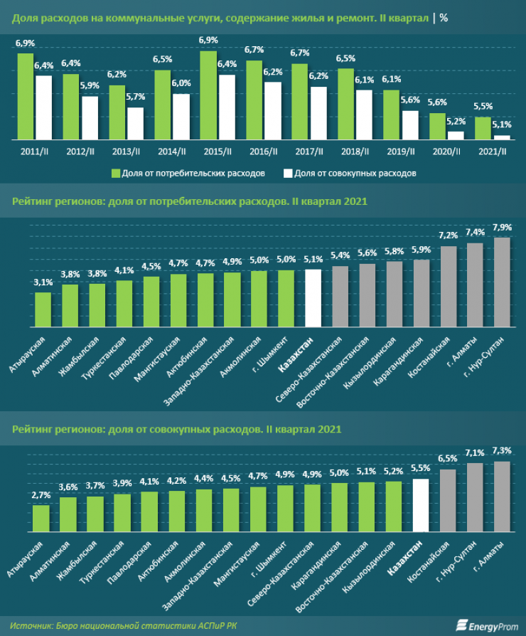 Во втором квартале 2021 года доля расходов на коммунальные услуги, содержание жилья и ремонт от потребительских расходов домохозяйств составила 5,5 процента, передает корреспондент Tengrinews.kz со ссылкой на energyprom.kz.