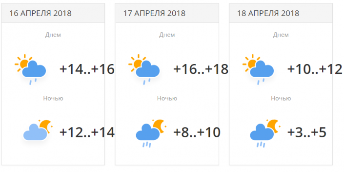 16 апреля днем температура будет находиться в районе 14-16 градусов тепла. Ночью похолодает до +12...+14 градусов. 17 апреля днем потеплеет до +16...+18 градусов, но ночью будет холоднее - +8...+10 градусов. 18 апреля температуры опустятся до +10...+12 градусов днем и +3...+5 градусов ночью.