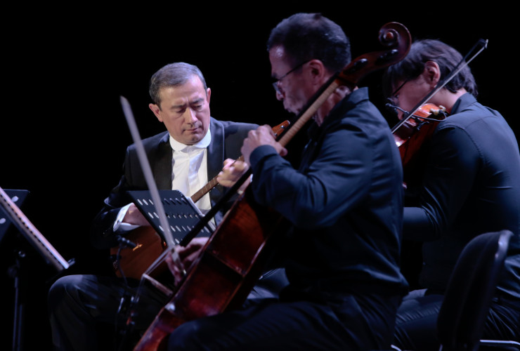 Домбыра әуеніне ішекті аспаптар квартетімен бірге филармонияның "Қорқыт" этно-ансамблінің әртісі Қазбек Атамбаев шебер меңгерген ұрмалы аспап кахон да қосылды.