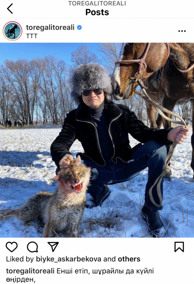 Известный казахстанский певец Торегали Тореали опубликовал фото с мертвым животным. Пользователи предположили, что артист охотился на лис и сфотографировался с трофеем. Действия Торегали Тореали вызвали неоднозначную реакцию среди казахстанцев. Одни осудили поступок певца и призвали наказать его, а другие, наоборот, похвалили за популяризацию охоты на животных. В Министерстве экологии, геологии и природных ресурсов отреагировали на фото певца, передает корреспондент Tengrinews.kz.