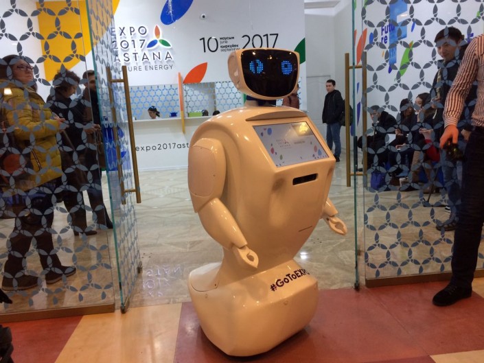 "Он разработан для общения в условиях большого скопления людей. Очень общительный, отвечает на все прямые и косвенные вопросы. Выдает всю информацию, играет, показывает фильмы. Он разработан студентами Московского технологического института, поддерживает русский, китайский и английский языки. Если ему задают вопросы на других языках, то он ищет ответы в интернете. Работает через WI-FI, подключен к поисковику Google. Может продать билет, открыть ссылку на онлайн продажи билетов и вы через его терминал можете купить билет. У него есть полноценный браузер, через который можно спокойно пользоваться интернетом, а также фотокамера с моментальной распечаткой фотографий. Он предназначен для презентации, информации, рекламы", - рассказали на открытии кассы в Астане.