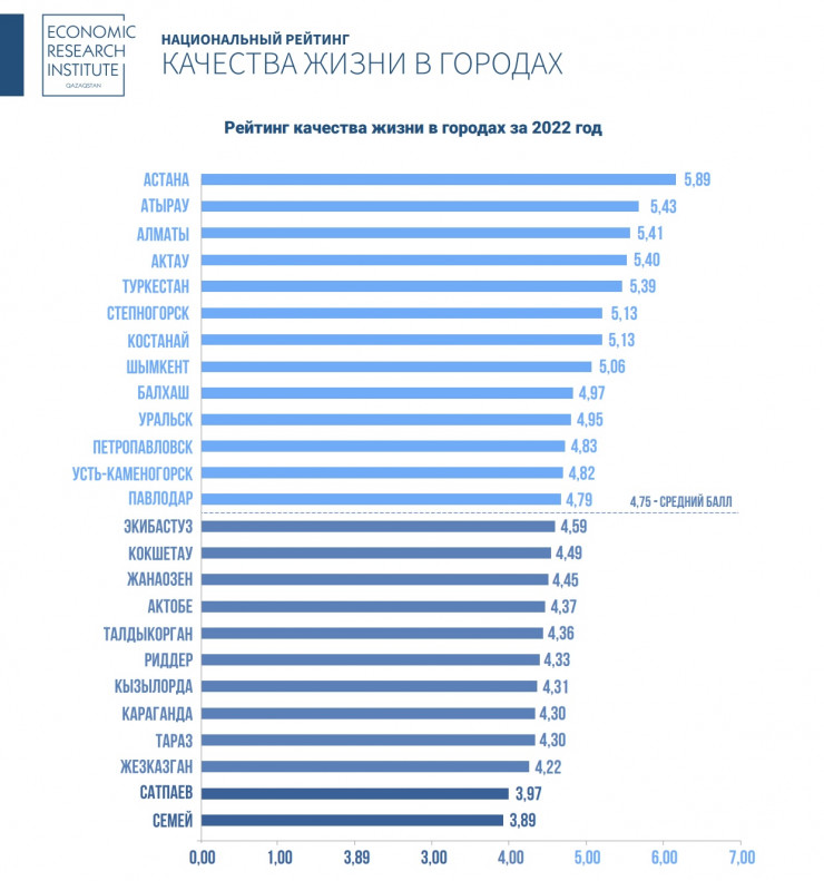 По итогам 2022 года Институт экономических исследований (ERI) подготовил Национальный рейтинг качества жизни в разрезе 25 городов Казахстана. Рейтинг включает 3 фактора: "Экономика и бизнес", "Человеческие ресурсы" и "Инфраструктура", передает корреспондент Tengrinews.kz.