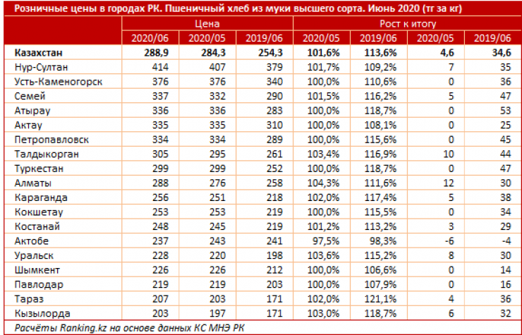 Ржано-пшеничный хлеб больше всего стоил в июне в Нур-Султане (315 тенге за килограмм), Усть-Каменогорске (314 тенге за килограмм) и Семее (313 тенге за килограмм). Дешевле всего его можно было купить в Актобе и Талдыкоргане (187 тенге за килограмм).