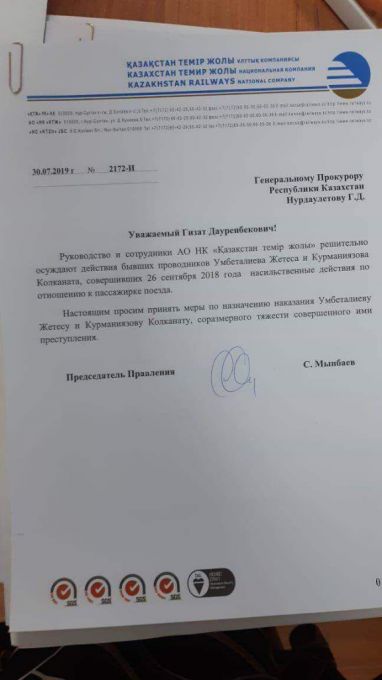 В письме за подписью главы компании указано, что руководство и сотрудники компании осуждают действия бывших проводников Умбеталиева и Курманиязова, которые изнасиловали пассажирку в поезде.
