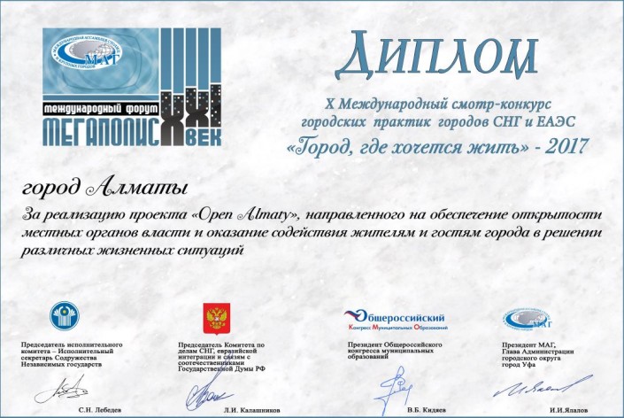 Наряду с проектом Open Almaty наград были удостоены города Казань за организацию системы "Открытые данные", Санкт-Петербург за создание "Единого окна" для инвесторов, Ростов-на-Дону за реализацию проекта электронного экскурсовода по городу.