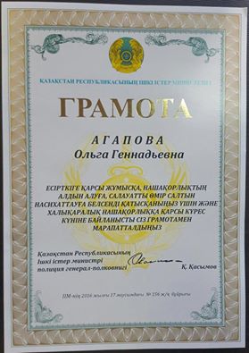 Казахстанке Ольге Агаповой вручили грамоту за содействие по борьбе с незаконным оборотом наркотиков. Грамота была приурочена и напечатана к международному дню борьбы с употреблением наркотических средств и их незаконным оборотом, который отмечается 26 июня. Правда, до Агаповой она дошла спустя полгода - 13 декабря документ доставили в ее офис, передает корреспондент Tengrinews.kz.