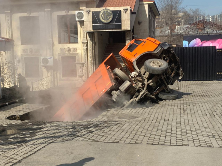 В социальных сетях сообщается, что грузовик провалился под землю на улице Кажымукана в Алматы.