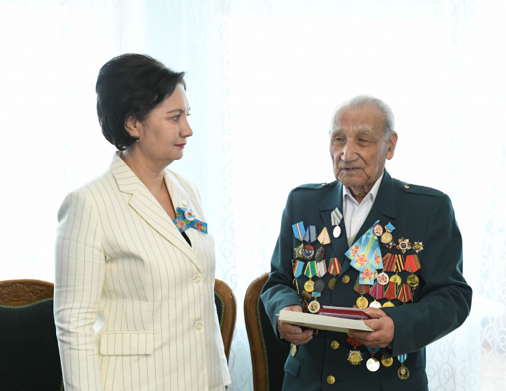 Аким Кызылординской области Гульшара Абдыкаликова поздравила ветерана Великой Отечественной войны Борибая Кулманова с Днем Победы.