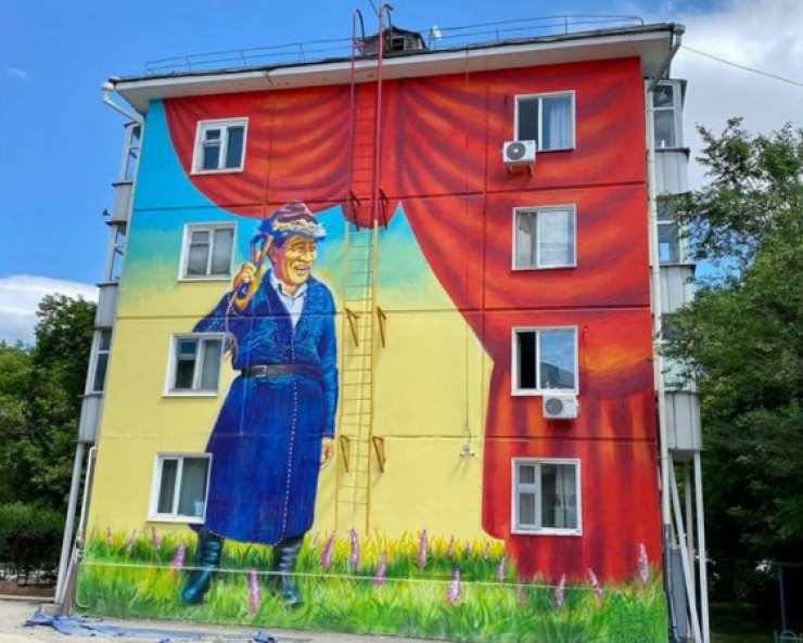 Еще один его проект - мурал на торце здания по улице Омарова, 64, под названием "Безбородый обманщик".