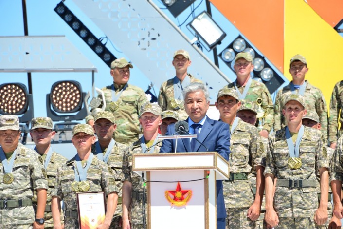 Министр обороны Казахстана Имангали Тасмагамбетов поздравил призеров Армейских международных игр-2016, передает корреспондент Tengrinews.kz со ссылкой на пресс-службу ведомства. Награждение победителей конкурсов "Мастера артиллерийского огня" и "Снайперский рубеж" состоялось сегодня, 9 августа, на полигоне "Гвардейский" в Казахстане.