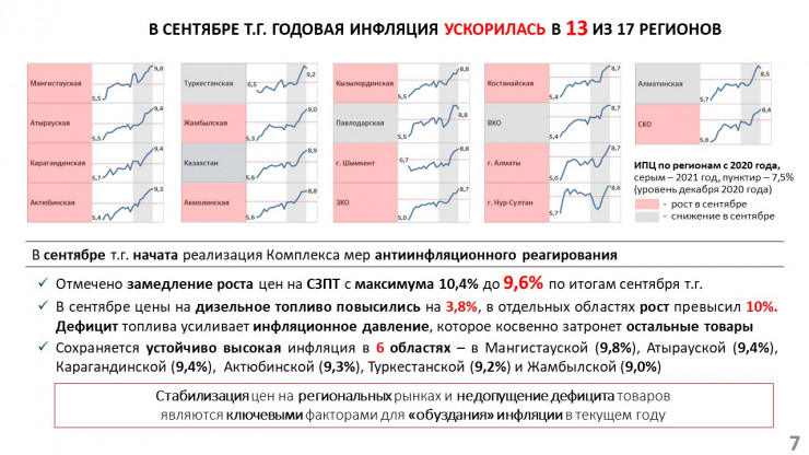"Для стабилизации немонетарных факторов в сентябре 2021 года правительством совместно с акимами начата реализация Комплекса мер антиинфляционного реагирования. В результате накопленный рост цен на СЗПТ снизился с максимума 10,4 процента в августе до 9,6 процента по итогам сентября 2021 года. Однако по итогам первой недели октября цены продолжили рост, составив 9,9 процента с начала 2021 года", - озвучил глава Нацбанка на заседании правительства.