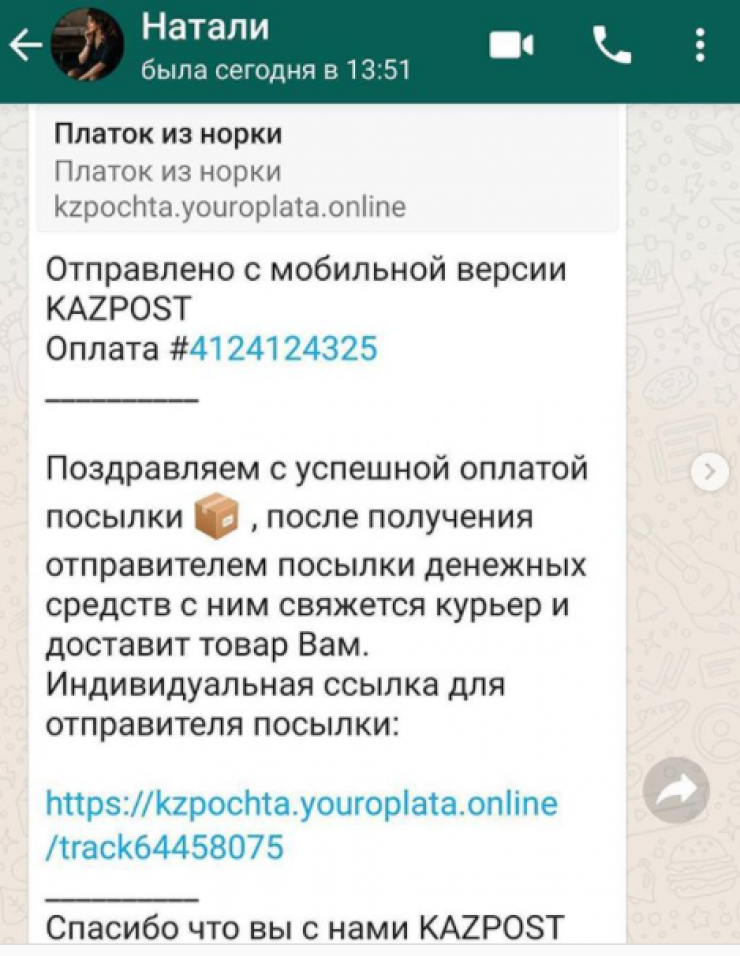 Женщина решила продать платок на платформе онлайн-объявлений. Ей ответил заинтересованный покупатель и попросил отправить товар почтой. Для оплаты он скинул ссылку, где нужно было ввести все данные карты, включая номер и трехзначный код. Таким образом интернет-мошенник получил бы доступ к банковскому счету продавца. Отмечается, что в этом случае аферисты действовали от имени "Казпочты". И сайт, на который вела ссылка, включал слово kazpochta. Официальный же сайт организации - post.kz.