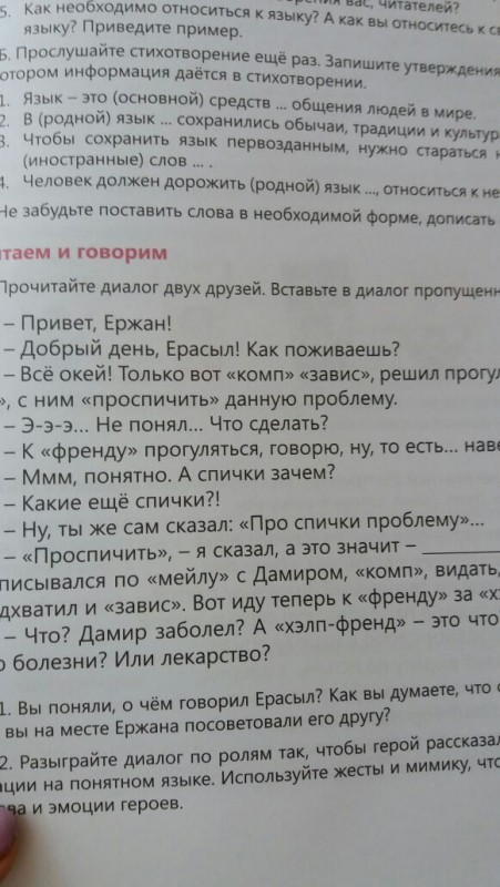 Использование слов "комп", "френд" и "проспичить" в учебнике для 5 класса объяснила автор Фото ©Турар Казангапов