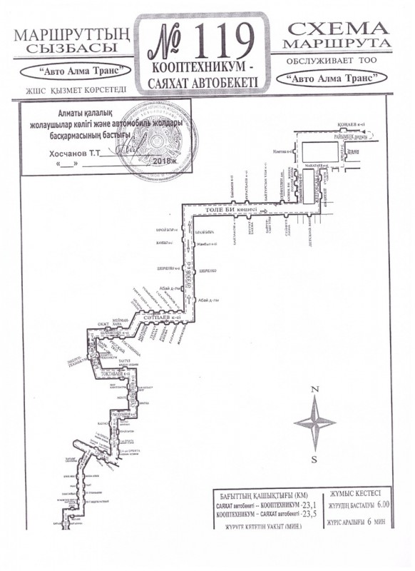 Маршрут № 119 следует по улице Ауэзова до улицы Толе би и далее по маршруту согласно утвержденной схеме.
