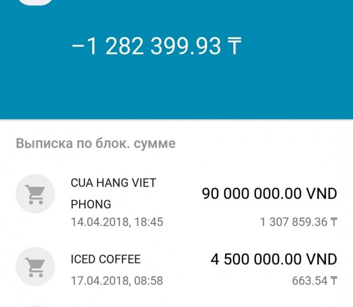 Через четыре дня в номере в отеле перед отъездом журналист обнаружила, что ее карточка заблокирована из-за огромного "минуса" на счете. "Я решила закрыть счет за мини-бар, так как возвращалась обратно в Казахстан. Но не смогла заплатить из-за заблокированной карты. Пошла в банкомат - нет доступа к деньгам. Решила посмотреть в хоумбанке, что происходит, и у меня чуть не случился инфаркт - я ушла в минус на 1,3 миллиона тенге! Эта сумма в блоке. Магазин показал чеки и выписку с терминала, все верно - 900 тысяч донгов. Но вдруг банк снимает с меня такую огромную сумму и закрывает мне доступ к карте", - поделилась алматинка.