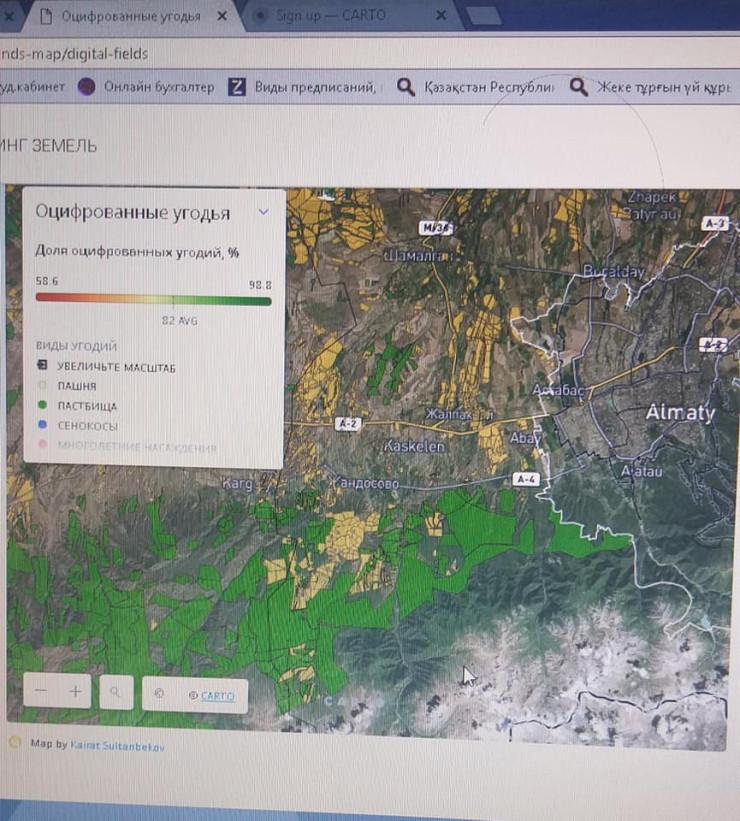 "На этом снимке с базы Qoldau ярким зеленым фоном отображены оцифрованные сельскохозяйственные угодья, которые уже ранее кому-то предоставлены под пастбище на срок до 49 лет! Отданы самые красивые предгорья и горы Иле-Алатауского национального парка с естественной средой обитания диких животных, птиц от границ Жамбылской области и Республики Кыргызстан до предгорья и горной местности Национального парка "Иле-Алатау" в районе Енбекшиказахского района Алматинской области", - сообщил Базарбек.