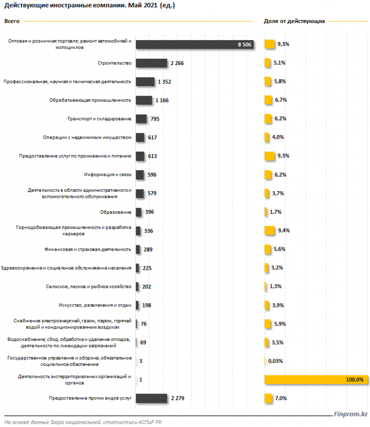 Больше всего иностранных компаний работают в сферах горнодобывающей промышленности (9,4 процента), торговли, ремонта автомобилей (9,3 процента) и сегменте HoReCa (9,3 процента). Меньше всего в сферах госуправления, обороны, в сельском, лесном и рыбном хозяйстве (1,3 процента).