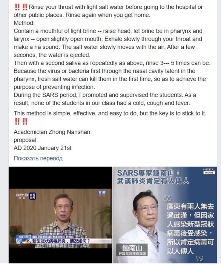 Коронавирус әлемге тарай бастағанда Weibo, Twitter мен Facebook әлеуметтік желілерінде тұзды сумен вирусты жеңуге болады деген ақпарат тараған. Олар жазбаларында қытайлық маман, Гуанжоу медициналық университетінің қызметкері Чжун Наньшаннің кеңесіне сілтеме береді.