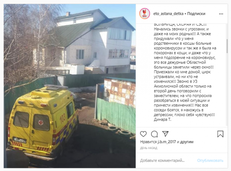 "Что такое коронавирус в Акмолинской области! У меня аллергический ларингит, вызвала скорую помощь, фото приложила, измерив температуру и давление, отвезли в областную больницу и оставили прямо на улице стоять, так как там не брали, у них карантин! После 40 минут ожидания я их поставила в известность и уехала, и там все началось: ДВД, ГУВД, областная больница, скорая, СЭС. Начались звонки с угрозами, и даже моим родным", - написала женщина.