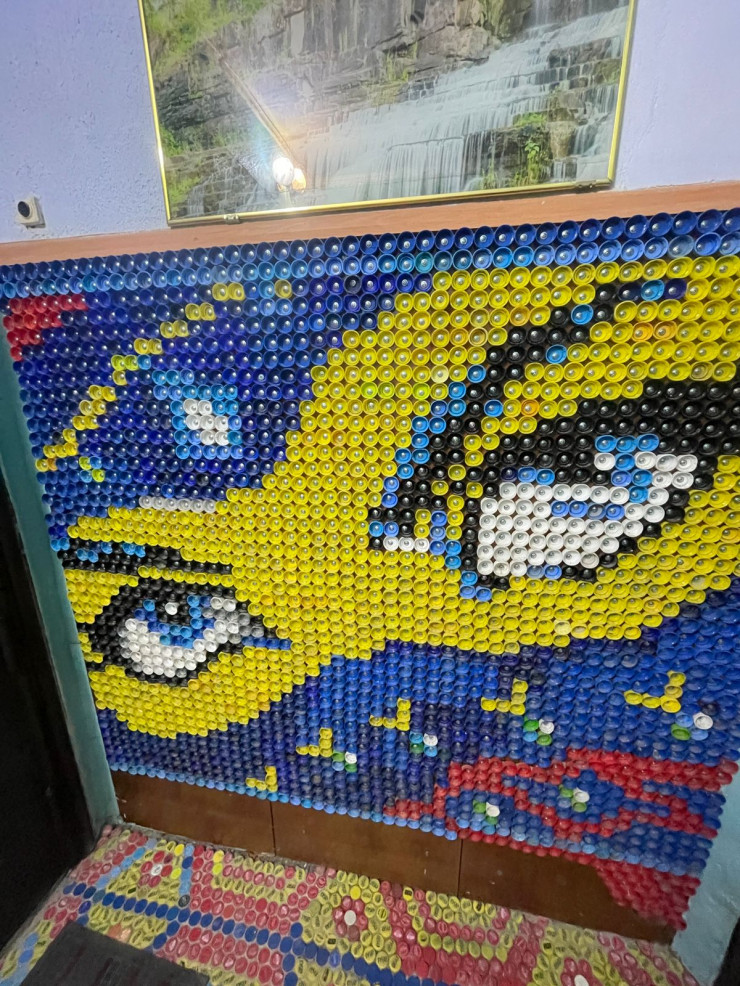 "Я раньше работал на местном комбинате. Был слесарем и мастером. Увлекался резьбой по дереву. Выйдя на пенсию, стал заниматься созданием картин из пластиковых крышек. Некоторые выкладывают из них дорожки на дачах, а я украсил свой подъезд. Начал еще во время пандемии. Первая моя работа – глаза в маске. Тогда же все носили маски - это было символично. Потом появились остальные картины. Я выложил полы и стены крышками, получилось как мозаика. В прошлом году создал картину барса, в этом - зайца. Соседям нравится", - рассказывает Юрий.