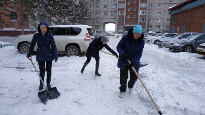 С утра горожане вышли из дома, чтобы убрать снег и наледь, не дожидаясь приезда коммунальных служб. Жители района Сарыарка по адресу: проспект Абая, дом 1, днем убирали снег во дворе, чистили пешеходные дорожки и детские площадки.