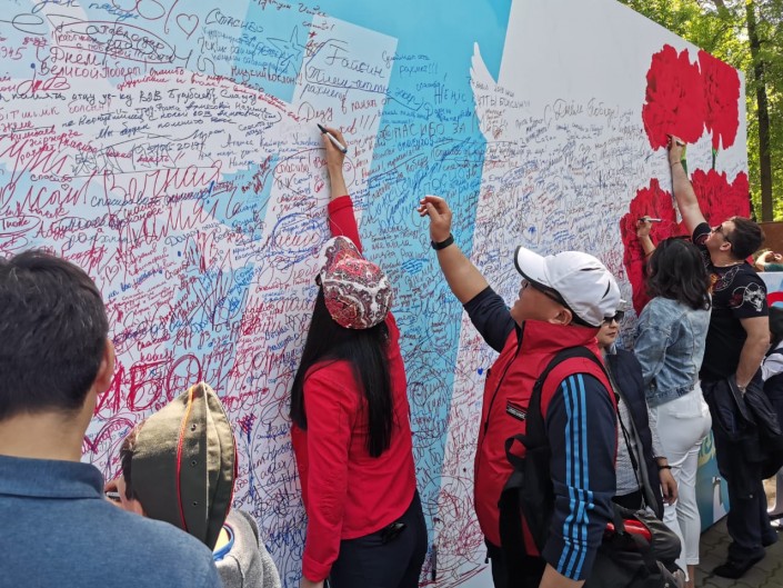 12.38. Алматы. Девочка пишет слова благодарности. "Ата, спасибо за победу!", "Мы всегда будем вас помнить", "Спасибо вам за мир!", - пишут юные жители города на стенде в парке имени 28 гвардейцев-панфиловцев.
