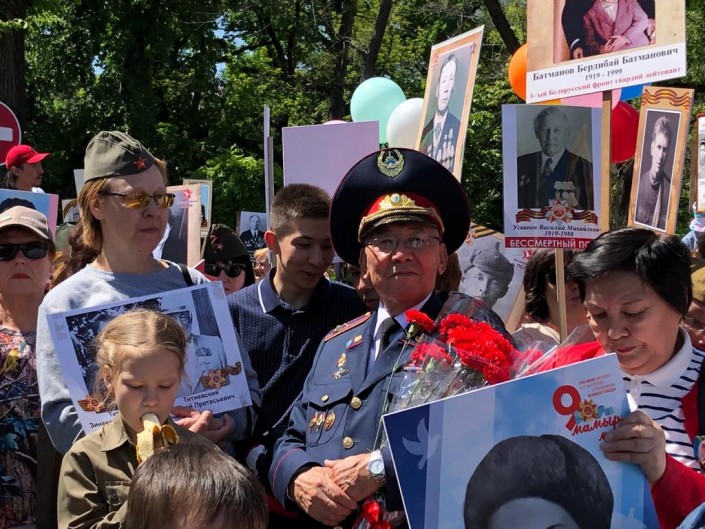 13.52 Во главе колонны сотрудников полиции в Усть-Каменогорске прошел 95-летний участник Великой Отечественной войны Курмат Рахимович Рахимов. До этого он несколько лет смотрел праздничные мероприятия только по телевизору. В этом году дедушка твердо решил, что должен встретить 9 Мая в строю.