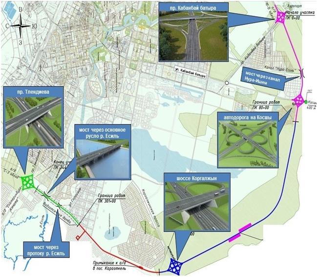 Автомобильная дорога берет начало с аэропорта, от существующего обхода и далее пересекает автомобильную дорогу на Косшы, после - шоссе Коргалжын и в конце участка соединяется с транспортной развязкой на проспекте Тлендиева. Общая протяженность проекта составляет 34 километра.