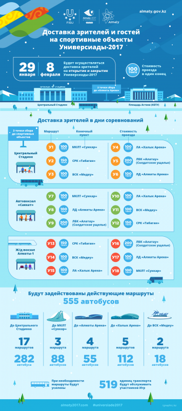 Особое внимание организаторы обещали уделить доставке зрителей и гостей на стадион "Алматы Арена" в дни открытия и закрытия Универсиады - 29 января и 8 февраля. Стоимость проезда на специальных маршрутах составит 100 тенге за одну поездку. Автобусы будут отправляться с Центрального стадиона и с площади "Астана".