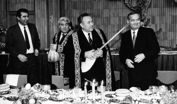 Сохранились фотографии Нурсултана Назарбаева с праздничных торжеств, на которых он держит в руках домбру.